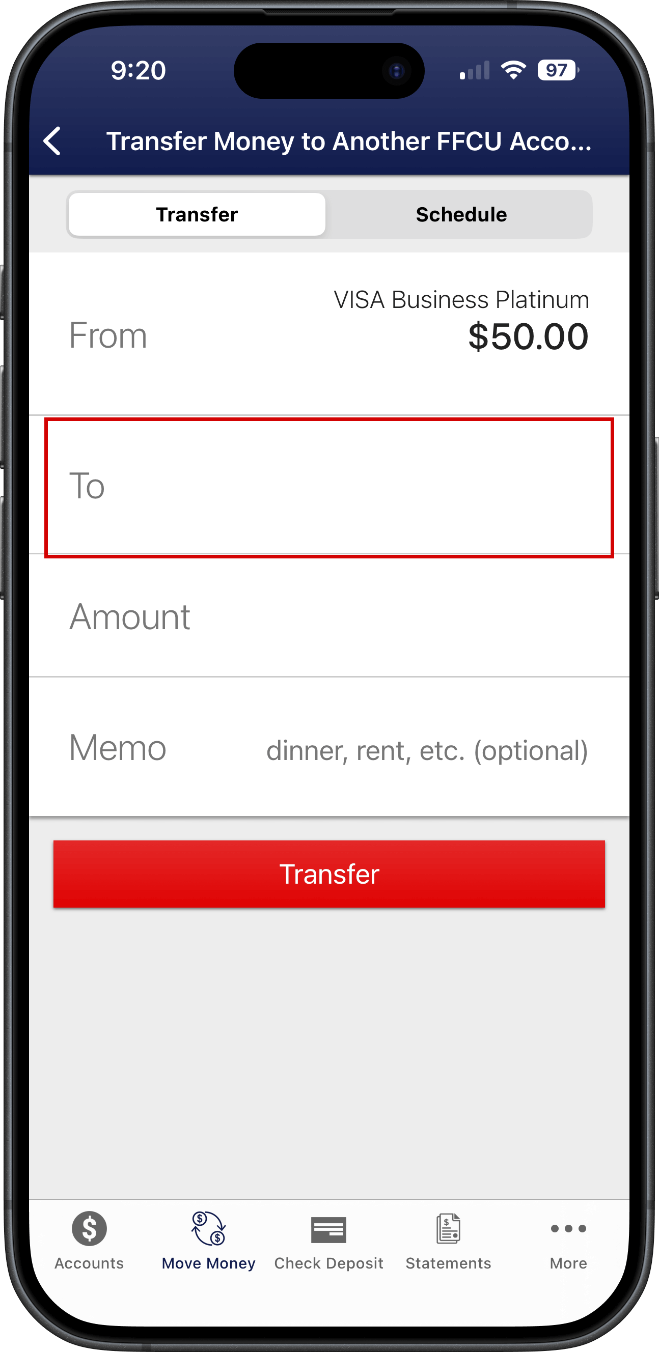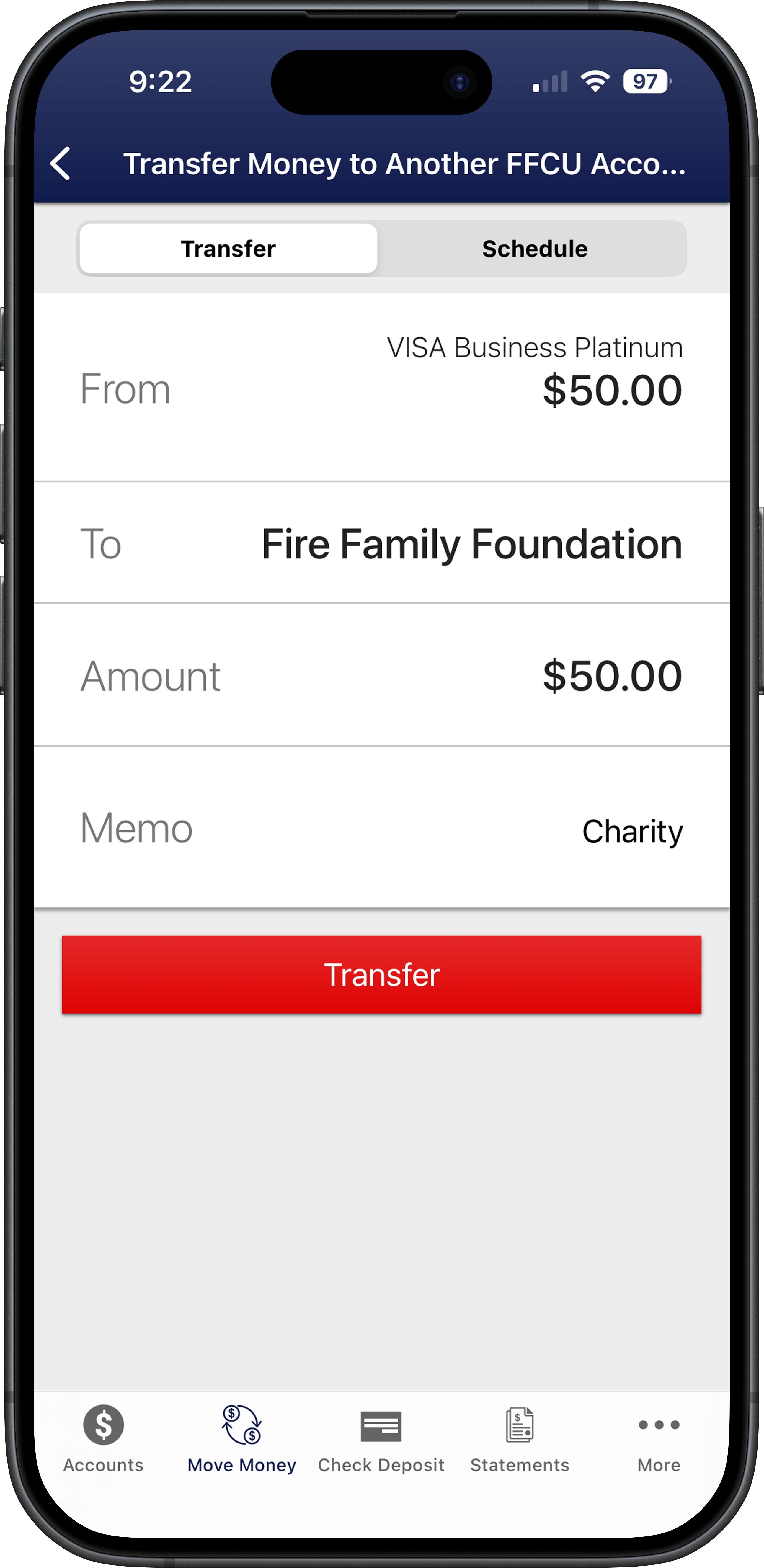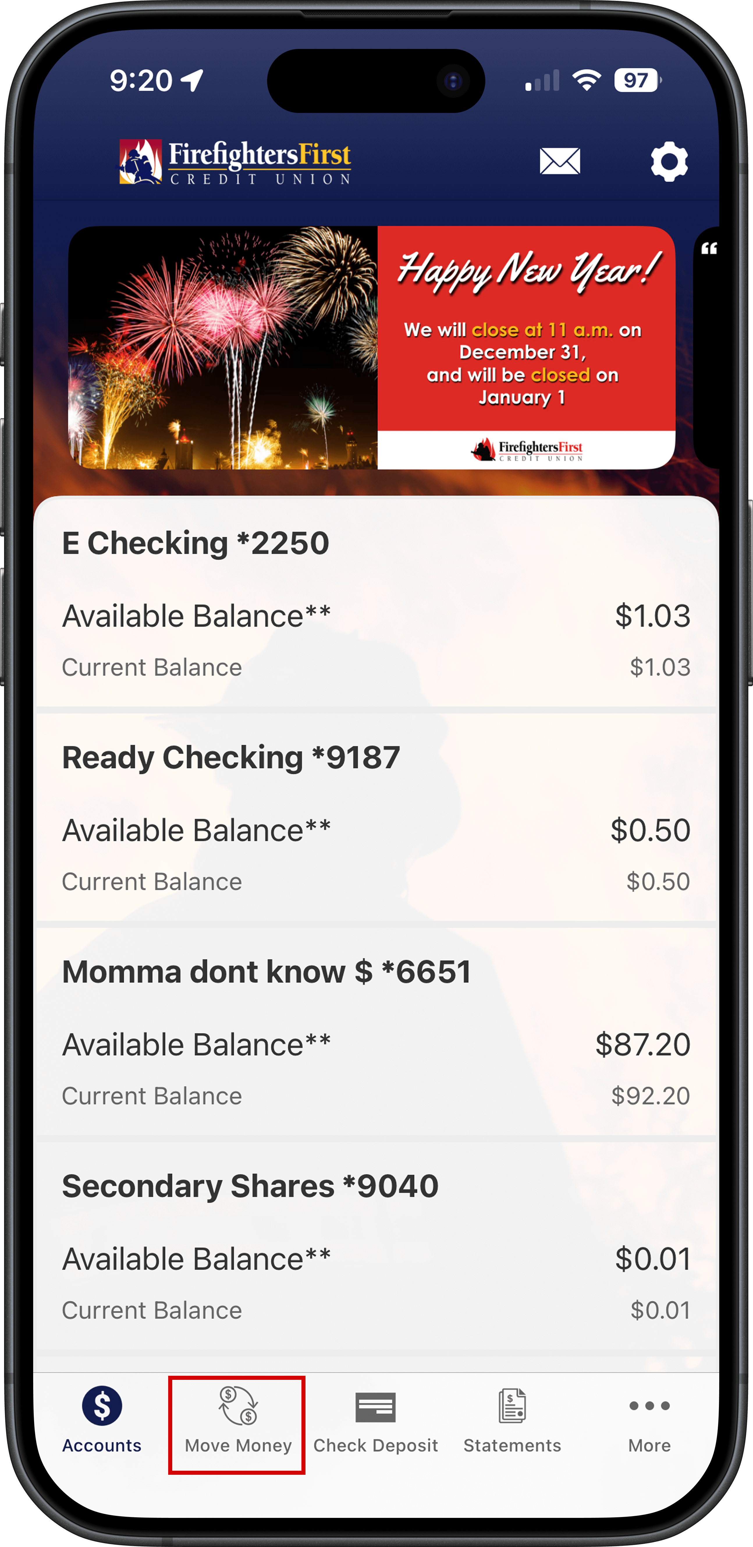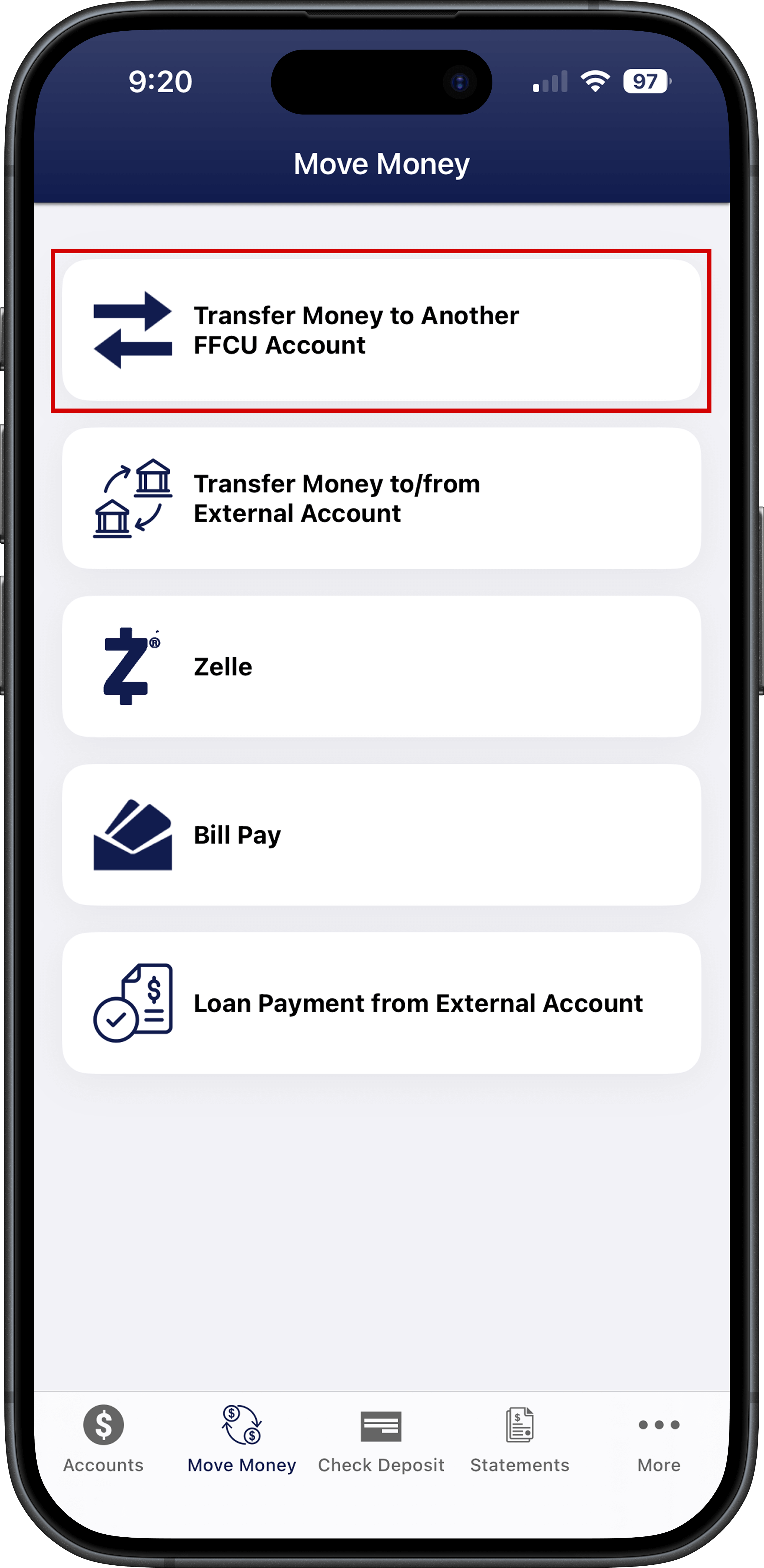 Step 1. Log into our mobile app (FireFirstCU) and click on "Move Money"