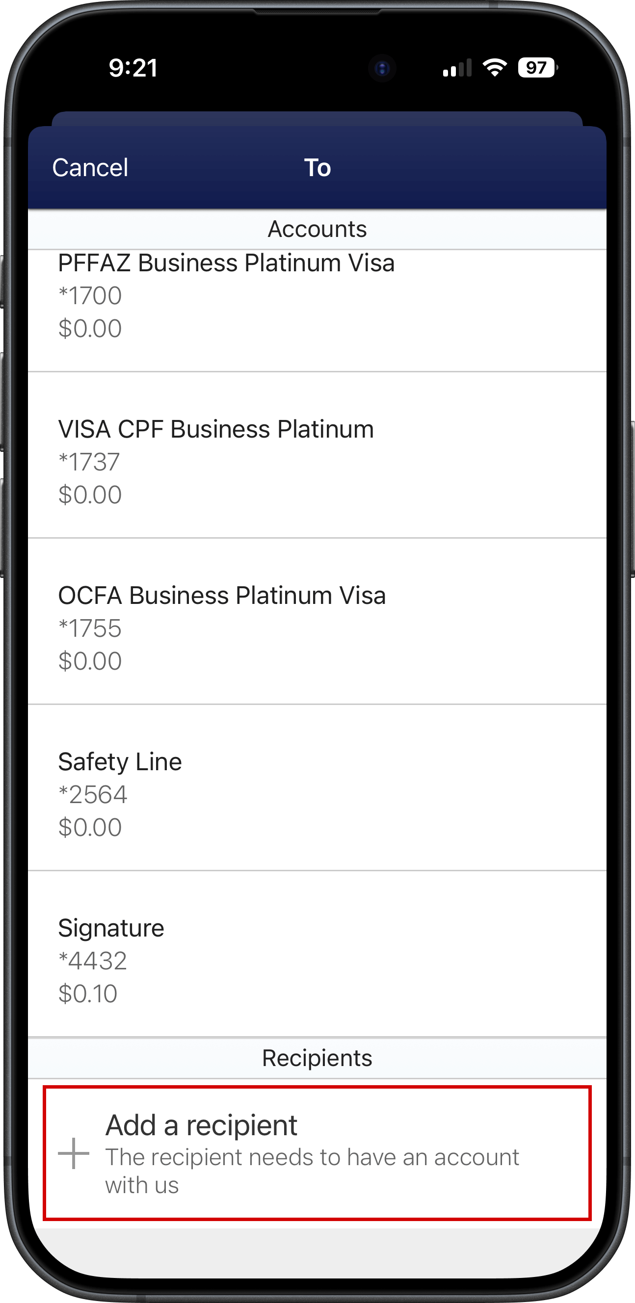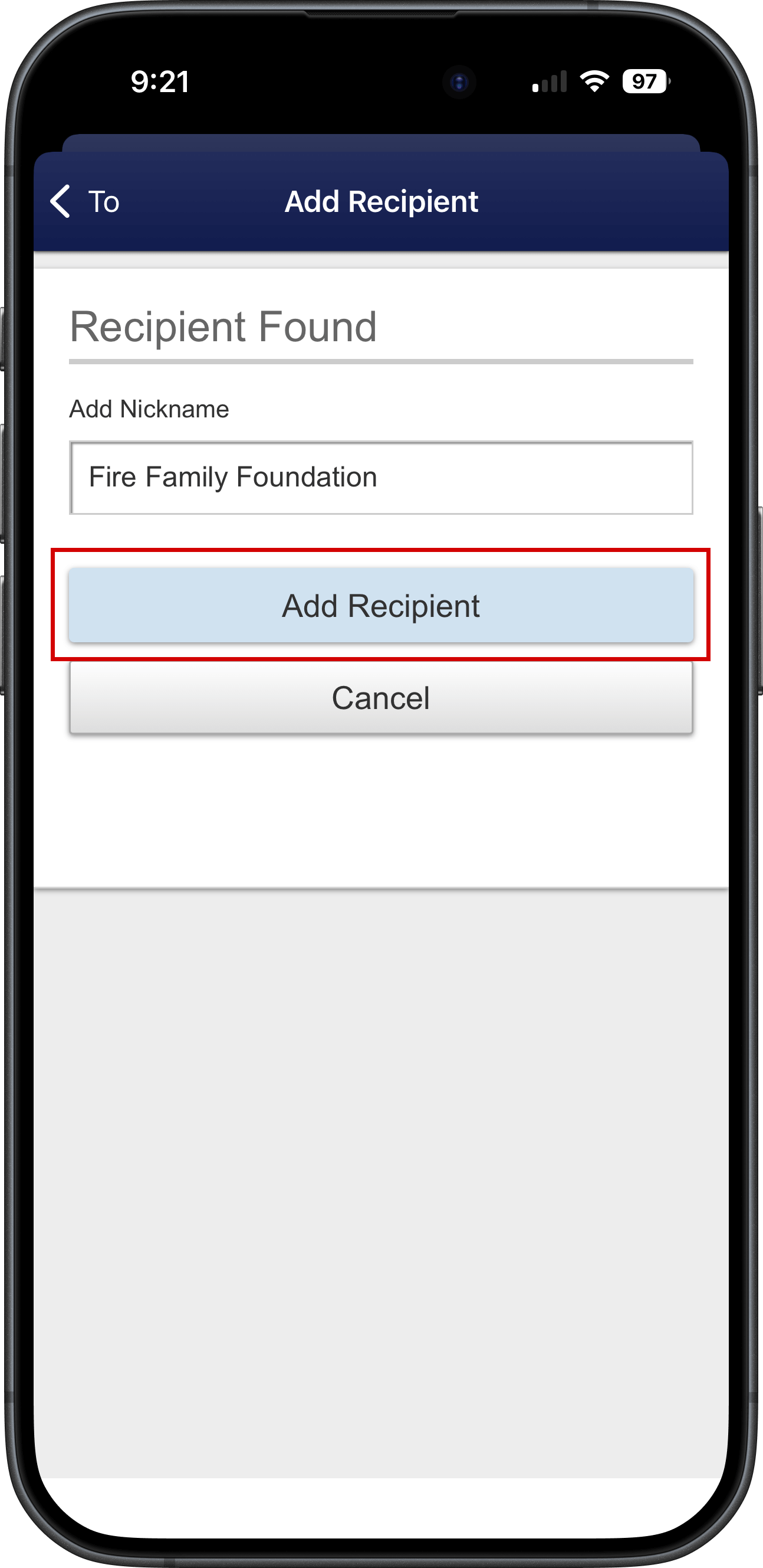 - Once the recipient is found, add a nickname like "Fire Family Foundation" and tap on "Add Recipient"