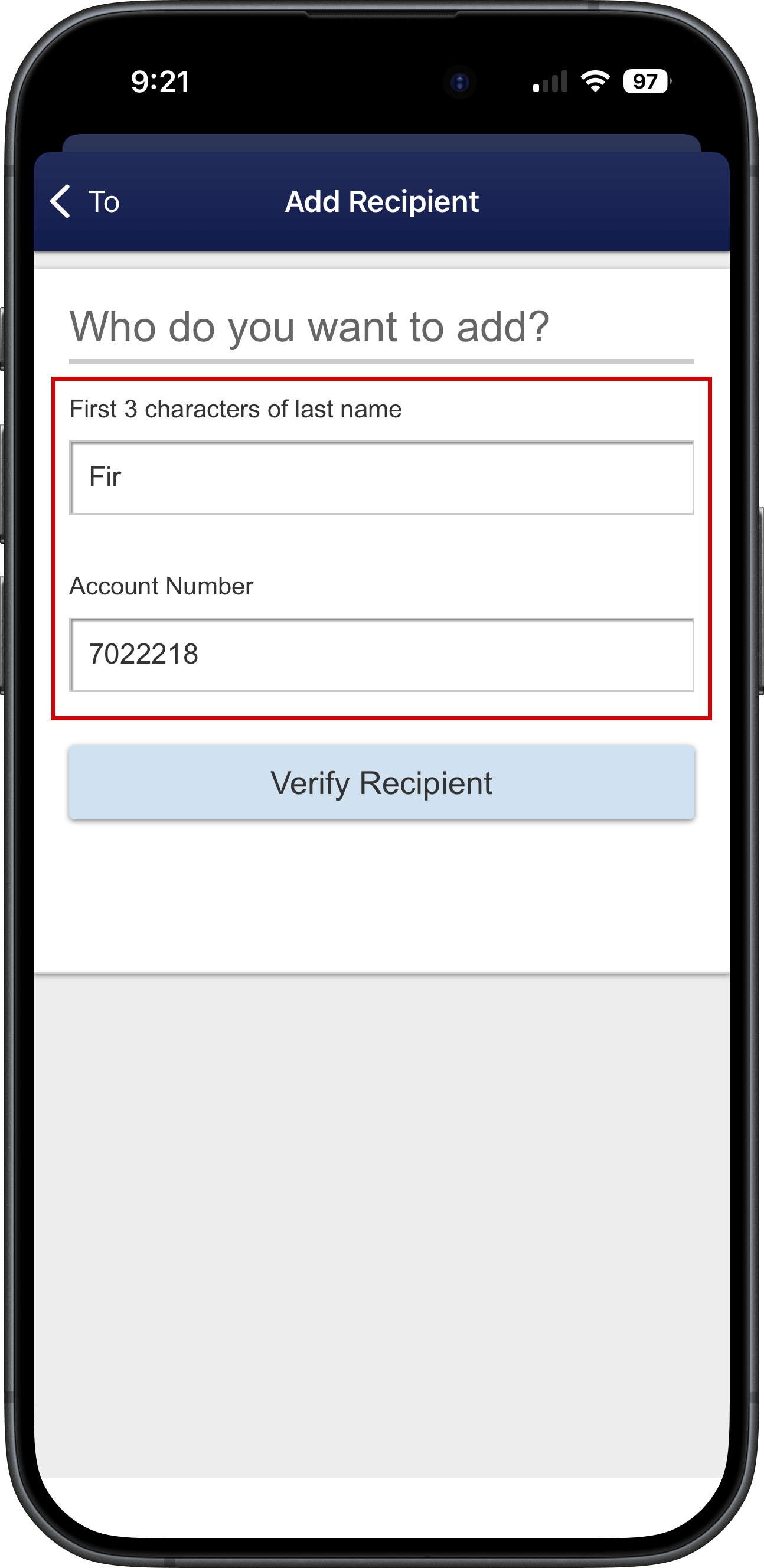 - On the Add Recipient screen, enter "Fir" and "702218" for the first 3 characters of the last name and the Account number